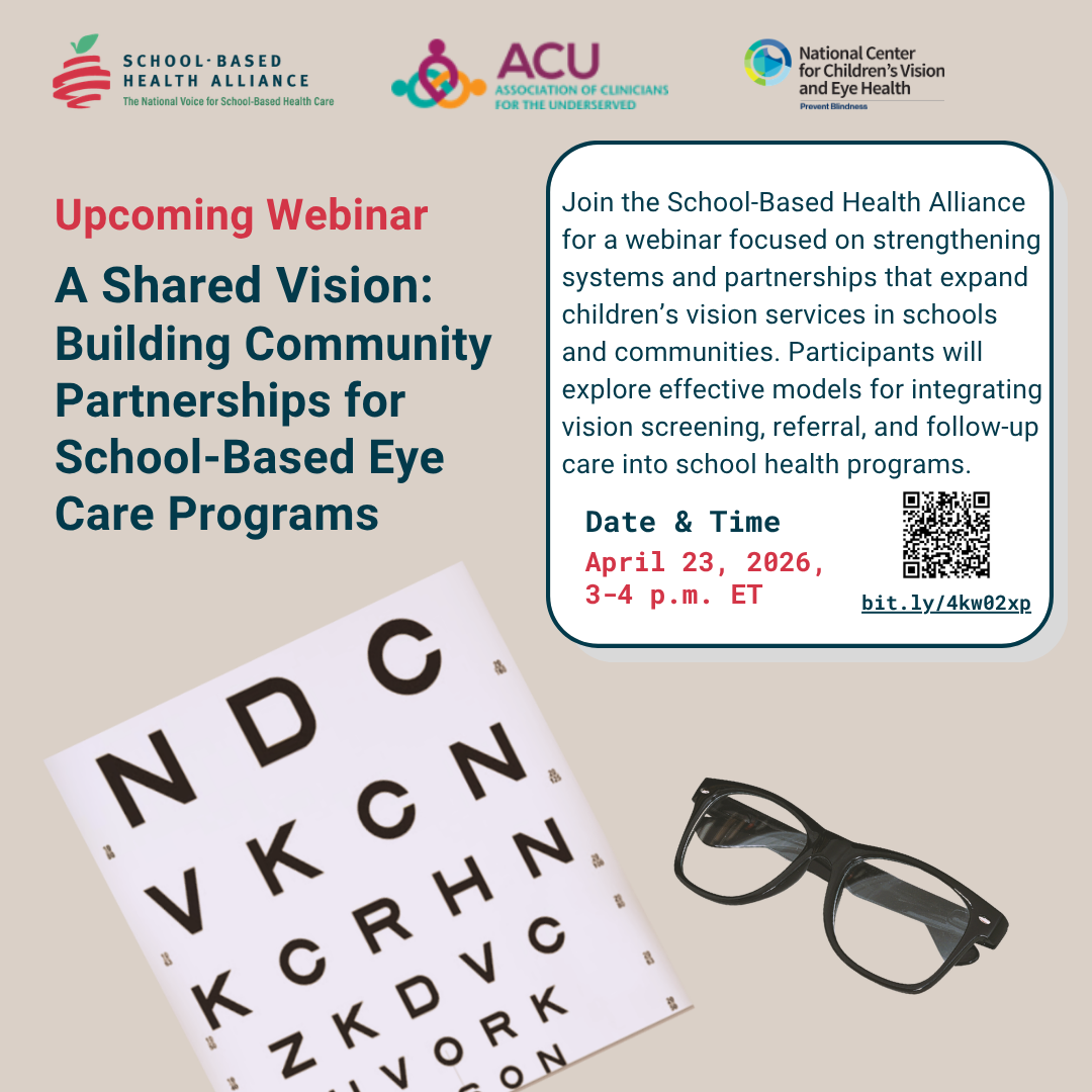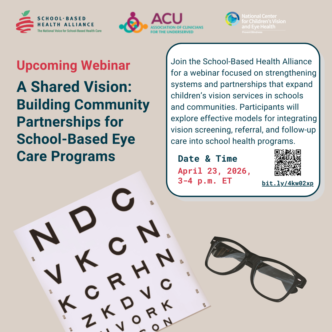 Join the School-Based Health Alliance on Thursday, April 23rd, 2026, from 3:00–4:00 pm ET for a webinar exploring strategies for leveraging diverse partnerships, such as academic institutions, school nurses, tele-optometry providers, rural health partners, school administrators, children’s hospitals, the Indian Health Service, and Medicaid programs, to expand access to school-based eye care. Presenters will highlight models from SBHCs that serve different populations and demonstrate a range of approaches, from on-site staff to mobile and visiting vision care services.