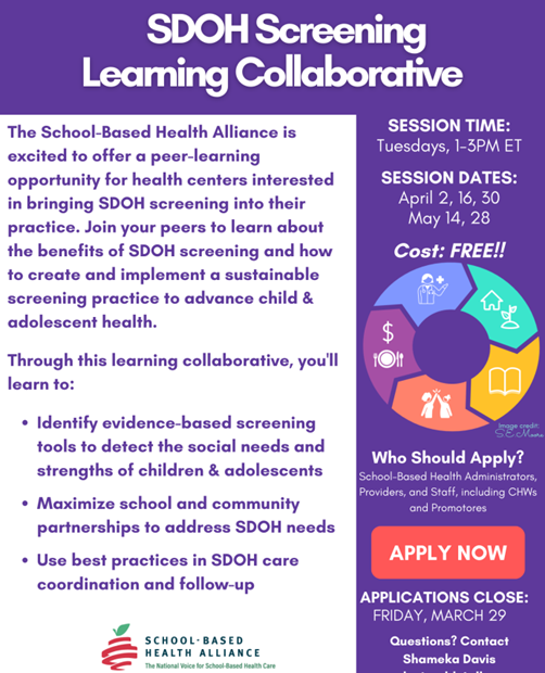 The School-Based Health Alliance is excited to announce a new learning collaborative on social determinants of health (SDOH) screening for children and adolescents. The goal of the initiative is to aid health centers in developing a sustainable screening practice. Participants… Read More »SDOH Screening Learning Collaborative